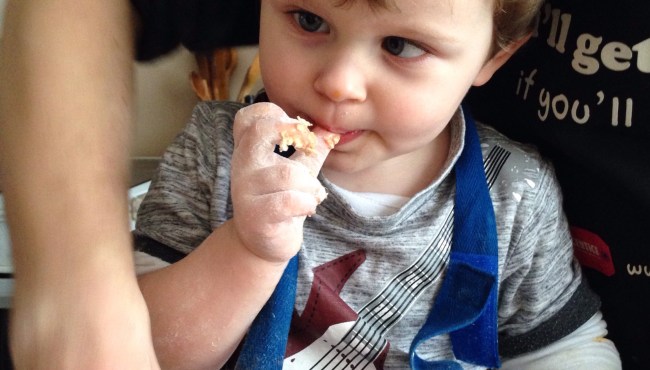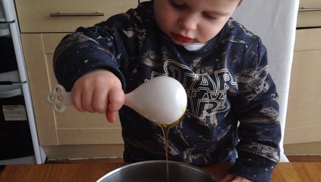 Notice in the photo above little man’s hair has added flour. This is one of the messy moments I have come to expect along with the egg cracking!